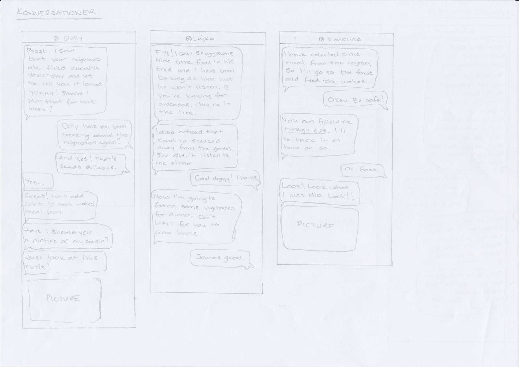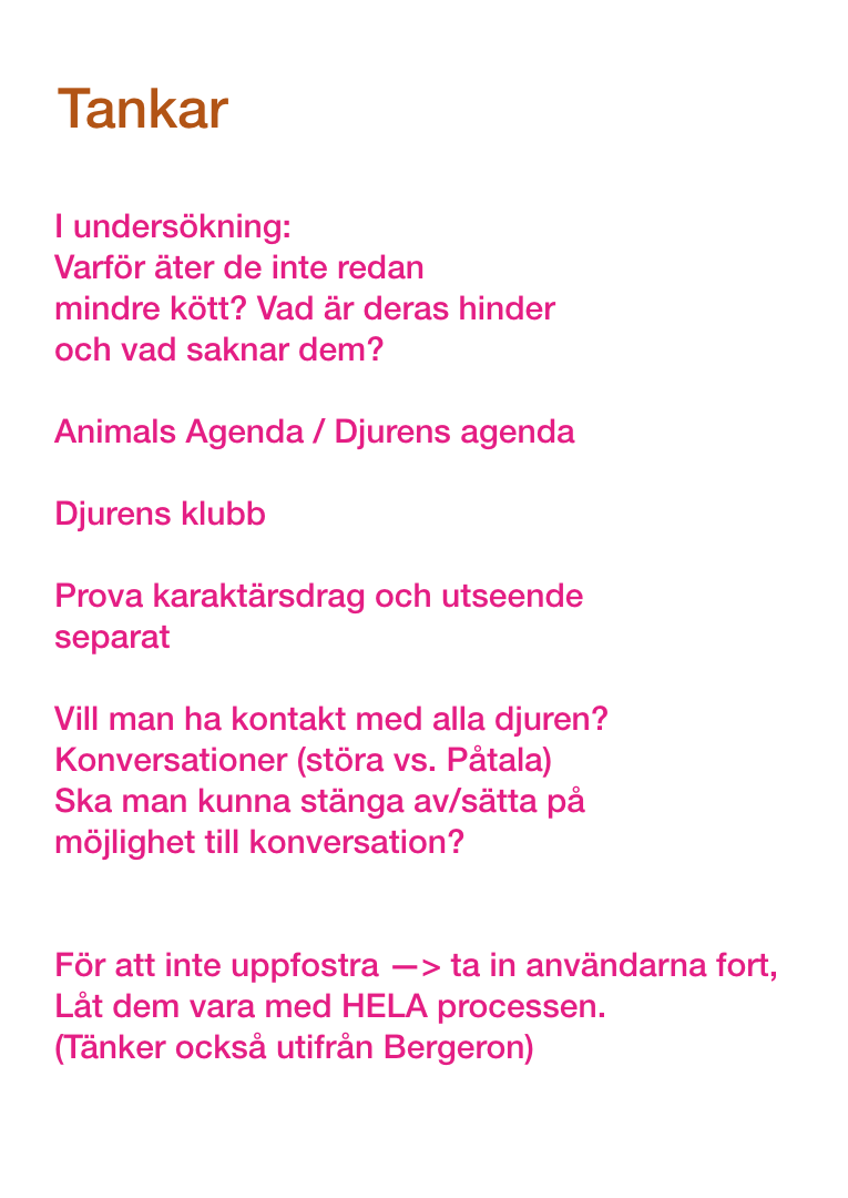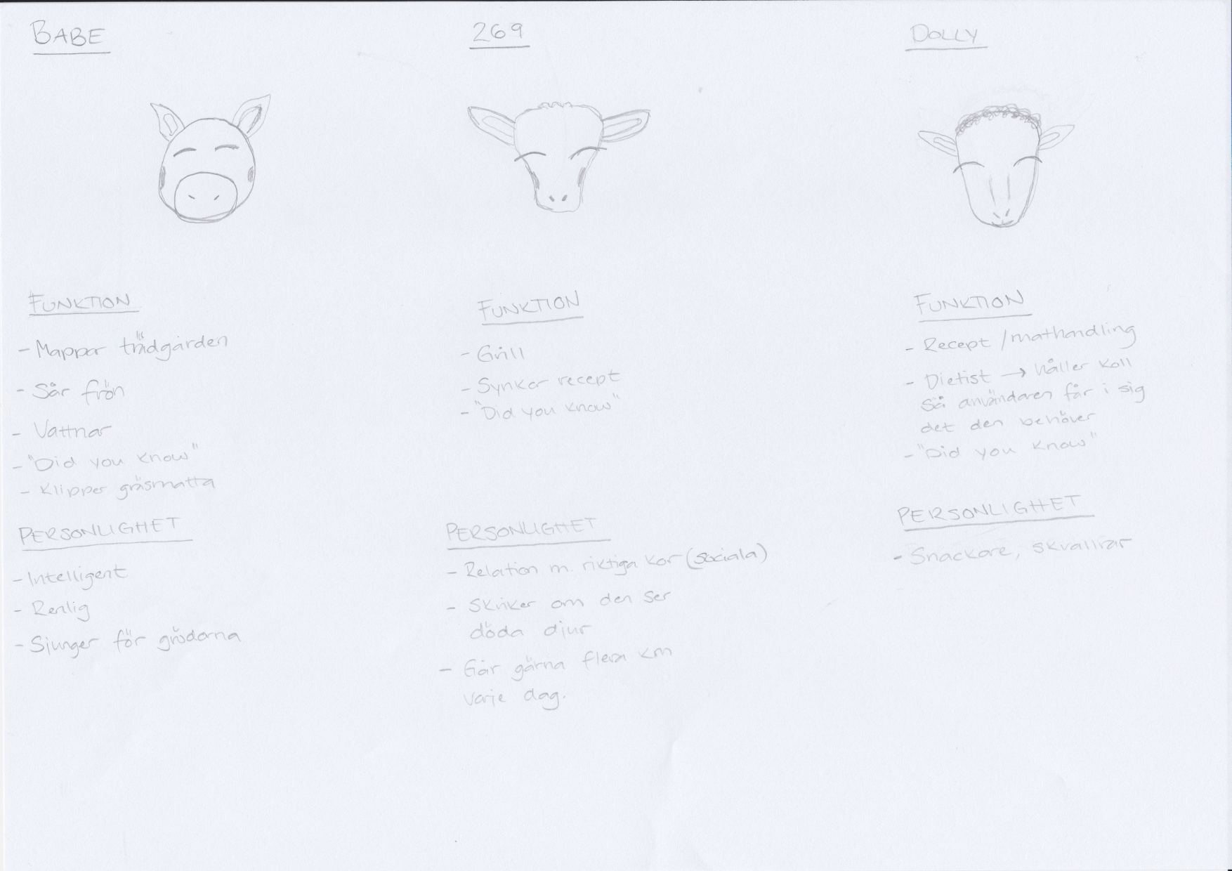 Nedan syns klickbara prototyper på mobilappen och bilder på karaktärsdrag, tankar och mindmap. I detta steg hade robotarna namn som Lajka, 269, Karolina, Babe, Automower, Anna, Skuggsvans och Dolly. Namnen bär på en historia, som skulle hjälpa informanterna att skapa känslor för robotarna. Till exempel robotkons namn, 269, kommer från "Calf 269" som räddades från att dö. Karolina, robotvargens namn, kommer från en Karolina som dog i ett varghäng. Och ett tredje exempel är Anna, robotkaninen, vars namn kommer från en forskare som tog fram ett alternativ till kanintester.