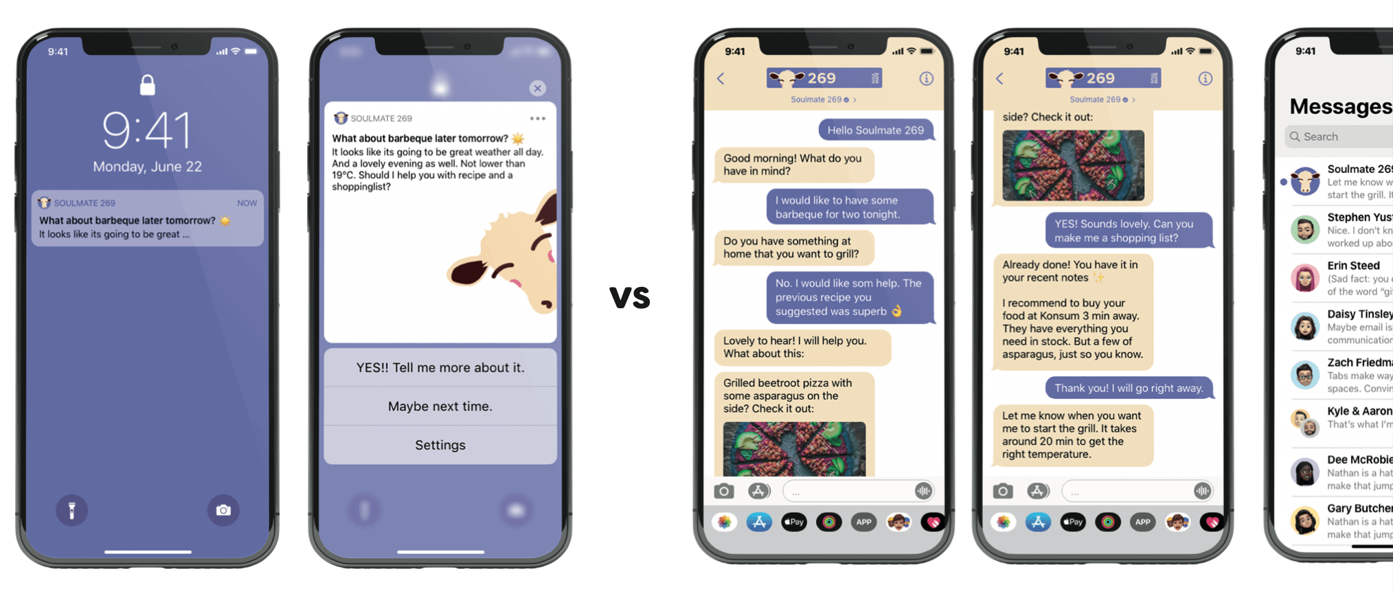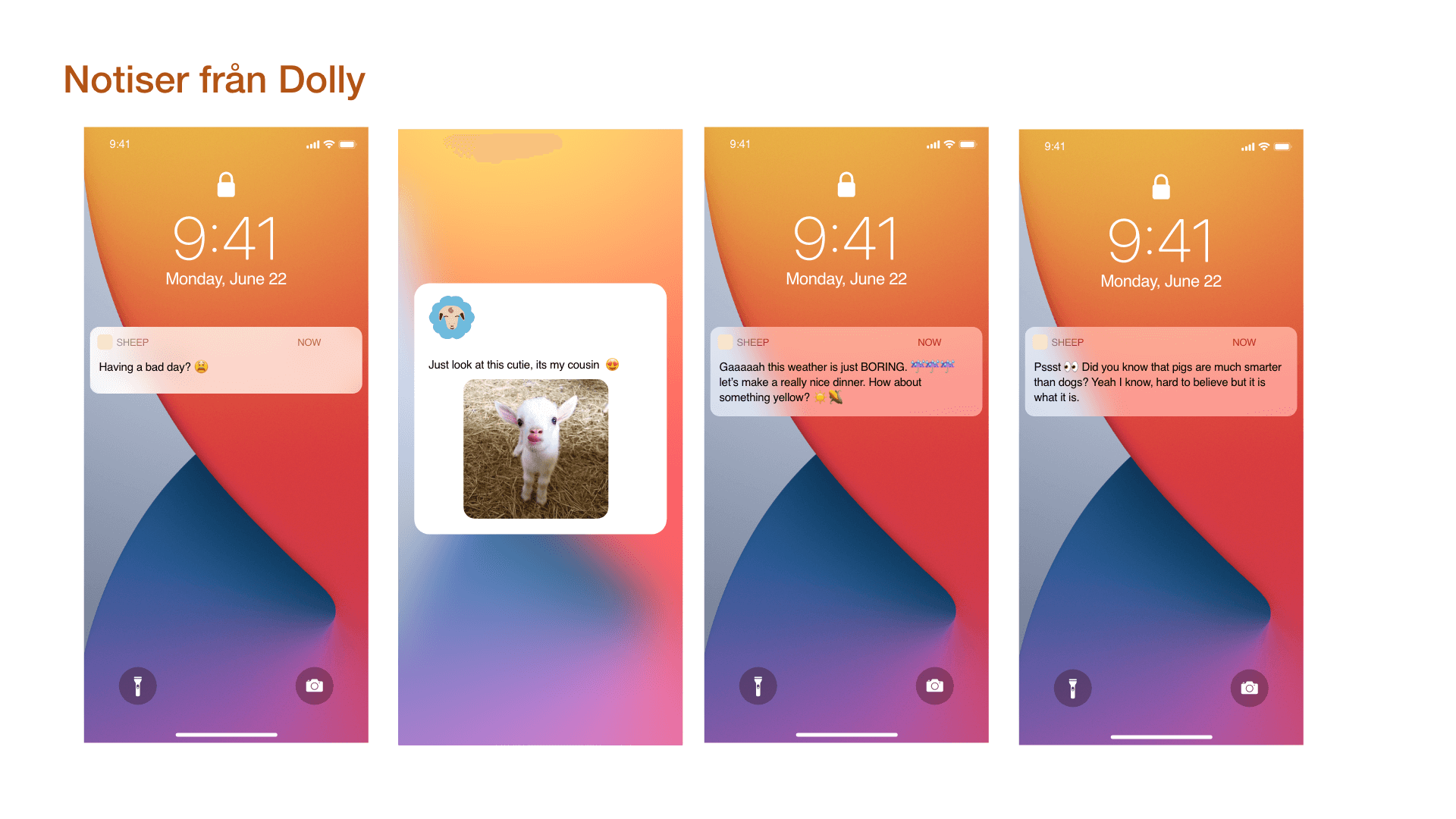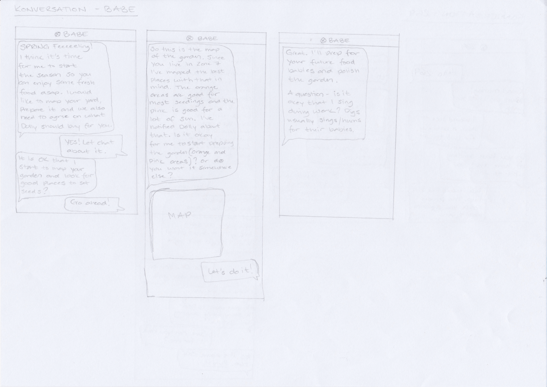 Nedan syns klickbara prototyper på mobilappen och bilder på karaktärsdrag, tankar och mindmap. I detta steg hade robotarna namn som Lajka, 269, Karolina, Babe, Automower, Anna, Skuggsvans och Dolly. Namnen bär på en historia, som skulle hjälpa informanterna att skapa känslor för robotarna. Till exempel robotkons namn, 269, kommer från "Calf 269" som räddades från att dö. Karolina, robotvargens namn, kommer från en Karolina som dog i ett varghäng. Och ett tredje exempel är Anna, robotkaninen, vars namn kommer från en forskare som tog fram ett alternativ till kanintester.