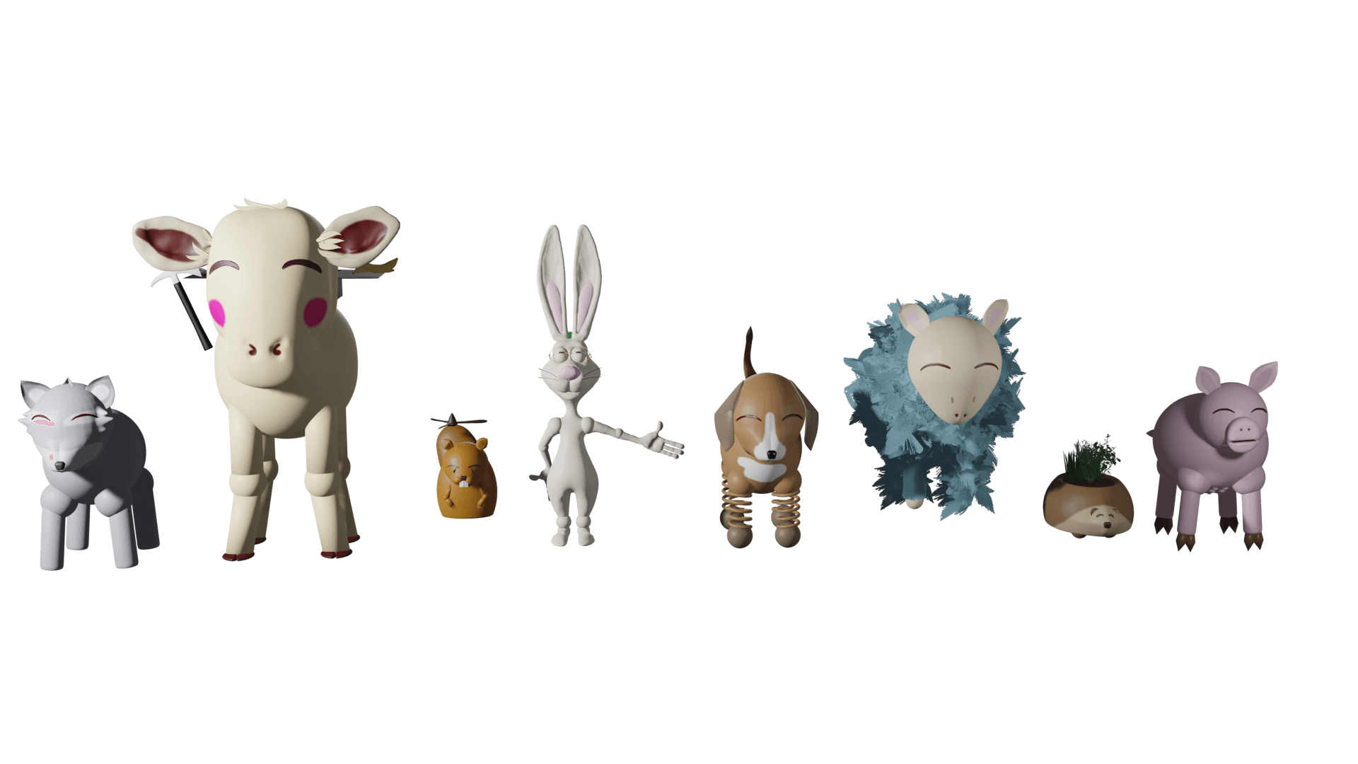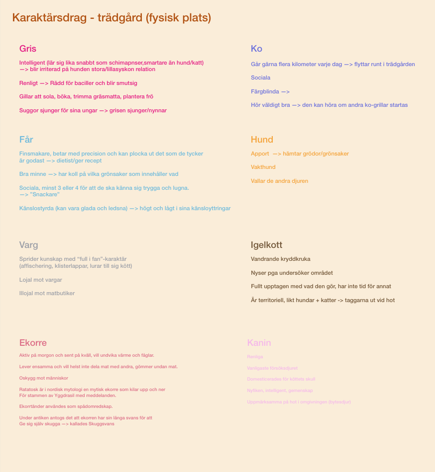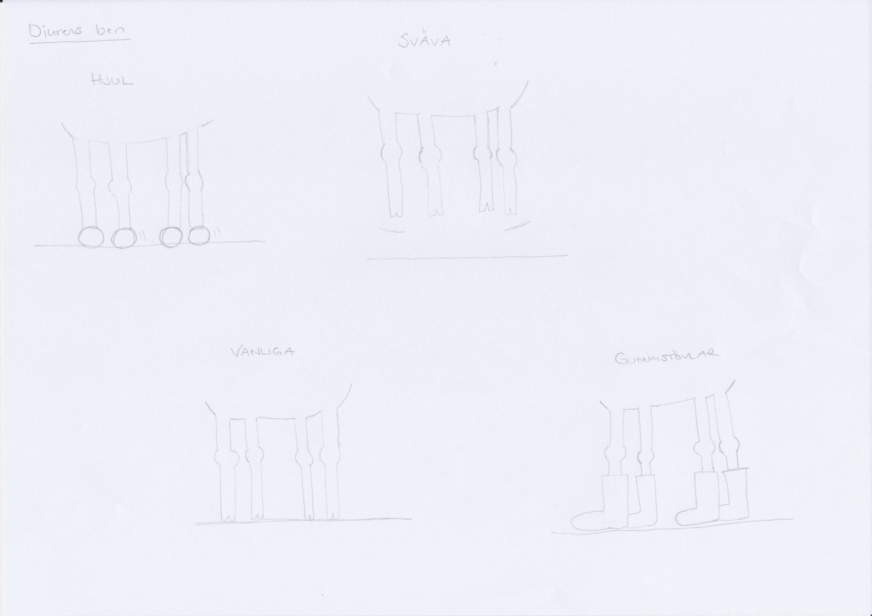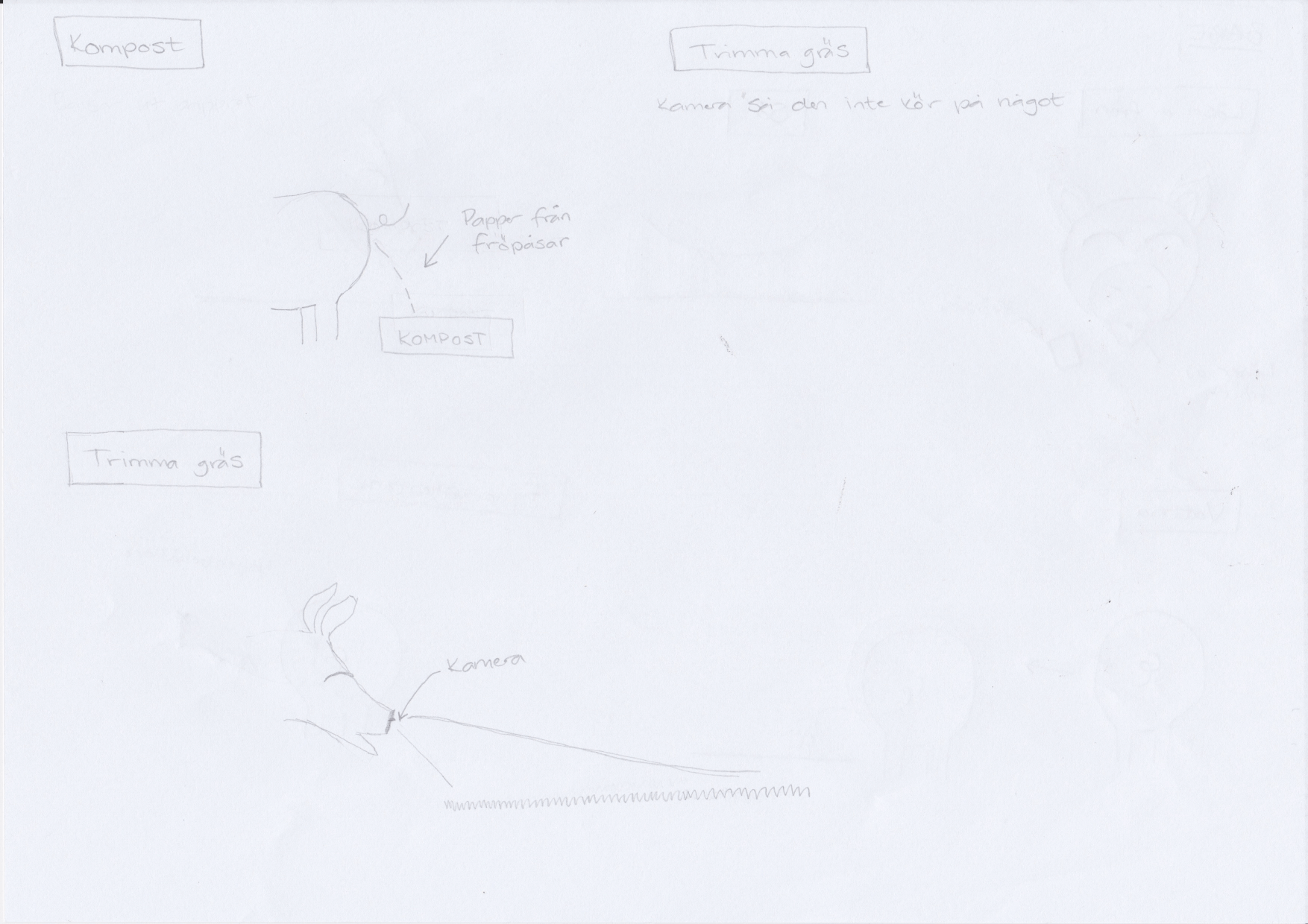 Det undersöktes hur robotarna ska se ut och agera. Ska de ha ett eget hus på trädgården? Ska de ha hjul som ben? Dessa robotar nedan reviderades bort. De var för långt ifrån studiens syfte om att konnotera djur i sin verkliga storlek och funktion. Huset blev en mer "nice to have" och ett tillägg istället för att ge något till projektet. Det rationaliserades bort för att ge mer fokus åt robotarna.