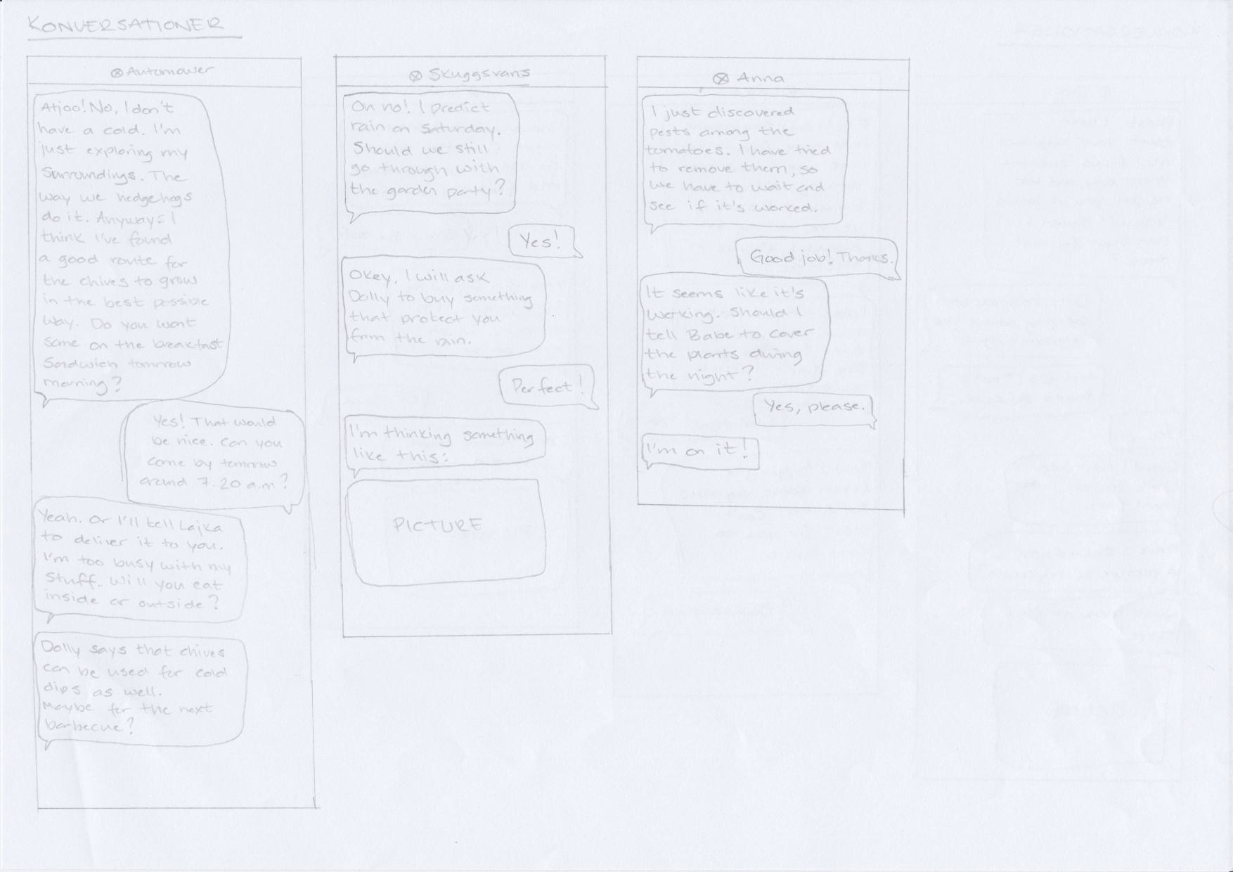 Det genererades åtta robotar med olika funktioner. Det skissades på tankar om att de har en egen klubb (som en lekstuga på en privat tomt, där robotarna laddas och förvaras) samt hur konversationer i en app kan komma att se ut.