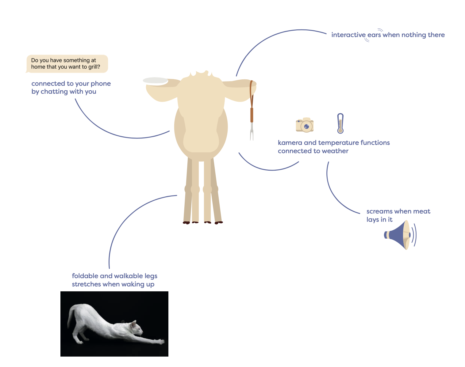 Skisser på den första roboten, kon, som ska agera grill och se ut som en ko. Syftet var att grillen skulle agera assistent vid grillning, och visa på alternativ till kött.