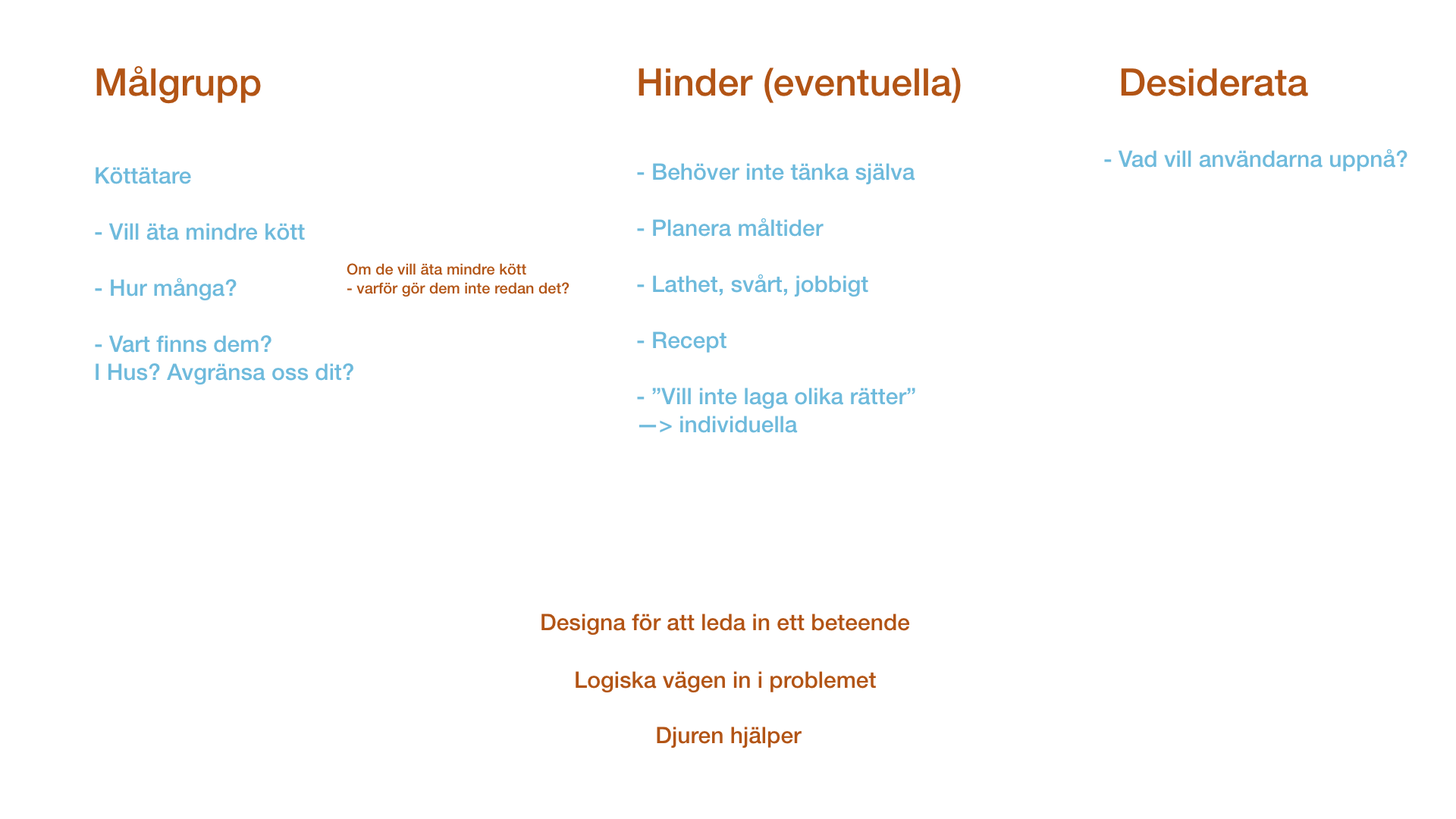Scenarierna Annan handel och Uppgiften är klar är ett resultat av ett magisterarbete på Högskolan Kristianstad av Isabelle Eerola och Therese Banström. I magisterarbetet ställdes frågan "Hur kan nudging appliceras genom ett spekulativt digitalt designkoncept med etologiska robotar?" där informanterna ser robotar som en lösning då robotar bland annat kan vara konstant närvarande, är inte dömande och kan leverera fakta och information. Det är viktigt att robotarna upplevs vänliga, och att de ska väcka tankar som genererar till en egen resa till (i vårt fall) minskad köttkonsumtion. Att nudge med robotar handlar om att vara transparent i vilket beteende som är önskat och inte tvinga fram ett förändrat beteende.